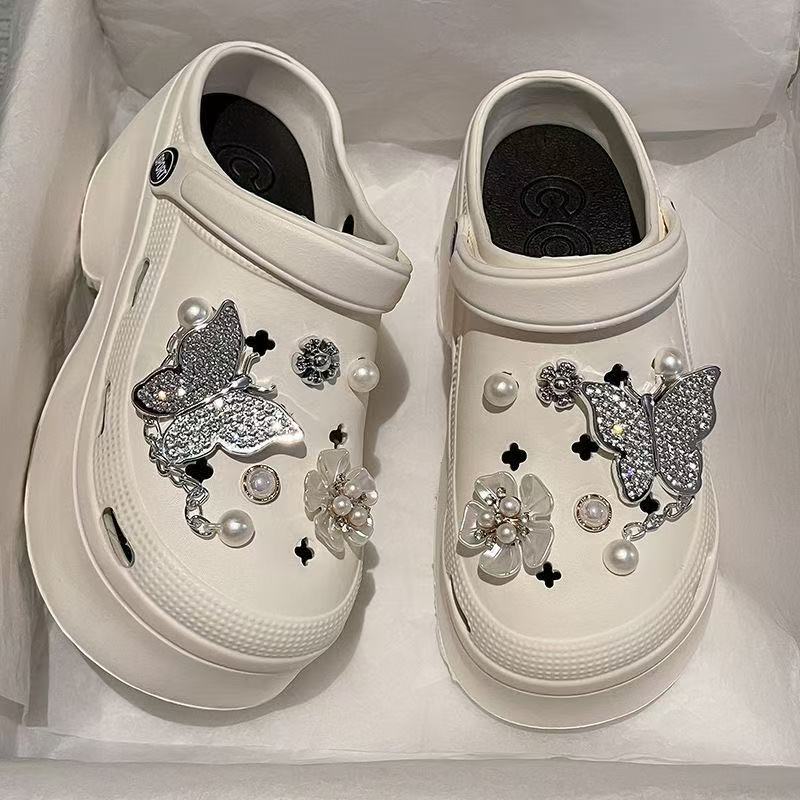 Upgrade your footwear collection with these butterfly charm platform clogs, designed for those who love a soft luxury aesthetic with everyday comfort. The clean white base is beautifully decorated with sparkling butterfly charms, pearl accents, and floral rhinestone details, giving the clogs a classy yet trendy look.
